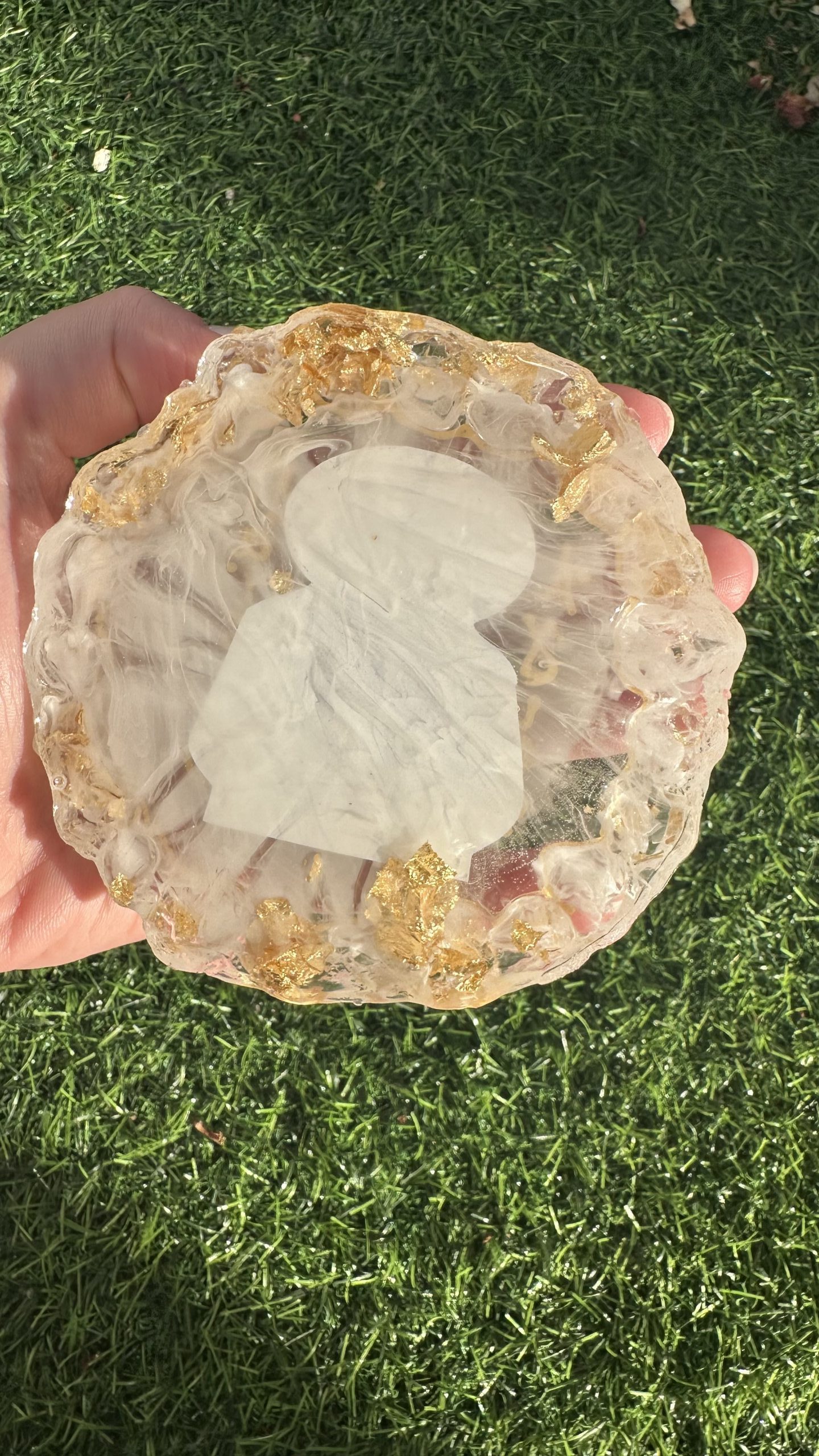 Χειροποίητη εικόνα Αγίου Νικολάου από υγρό γυαλίΗ εικόνα είναι σε διάμετρο 9 εκατοστών, σε λευκές αποχρώσεις με φύλλα χρυσού. Η εικόνα διαθέτει δική της χειροποίητη βάση. Ο χρόνος παράδοσης κυμαίνεται από 8 έως 15 ημέρες.