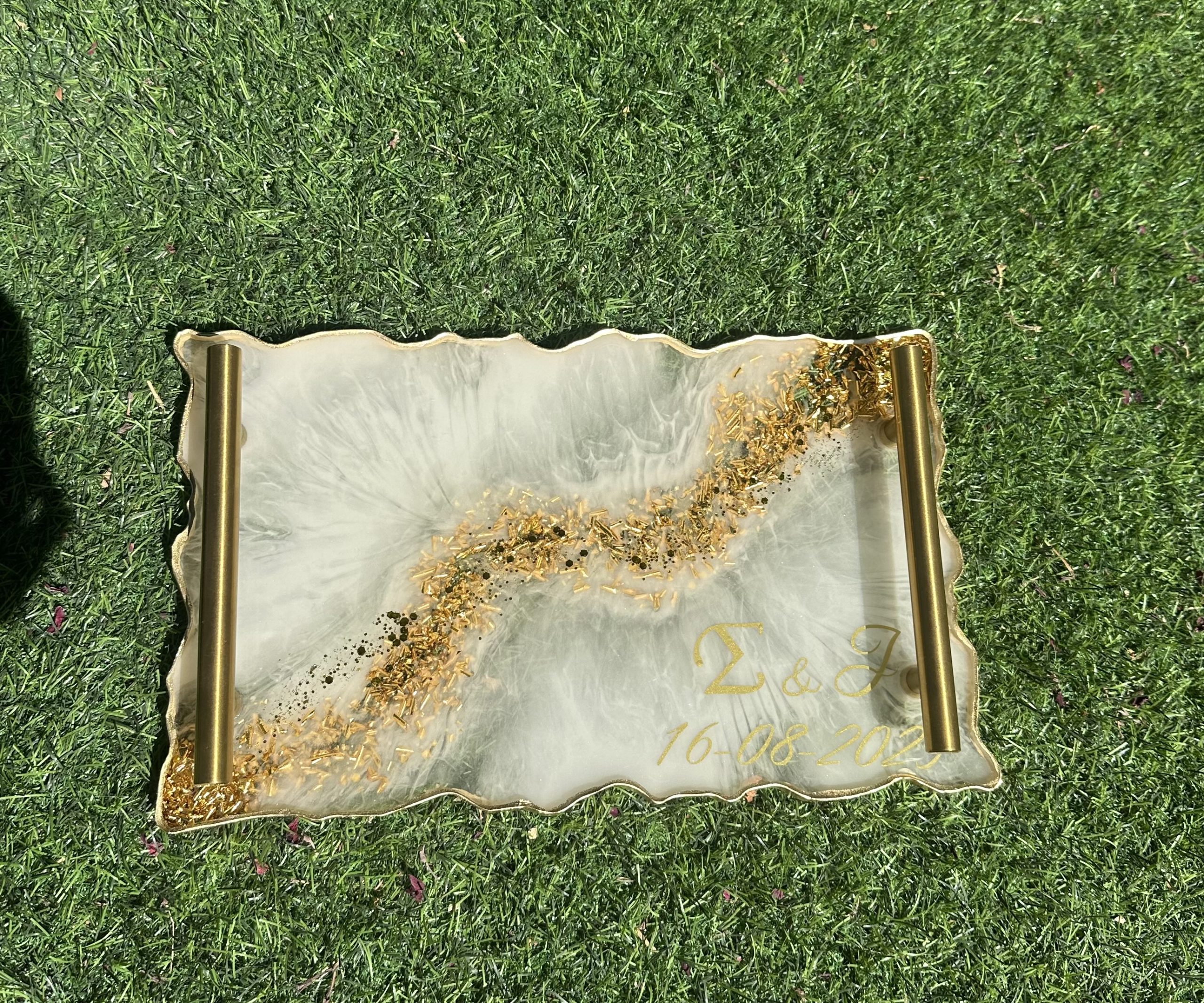 Χειροποίητος διακοσμητικός δίσκος από υγρό γυαλίΟ δίσκος είναι προσωποποιημένος σε διάσταση 30 εκατοστών, σε λευκές αποχρώσεις με ασημένια φύλλα. Ο χρόνος παράδοσης κυμαίνεται από 15 έως 30 ημέρες.